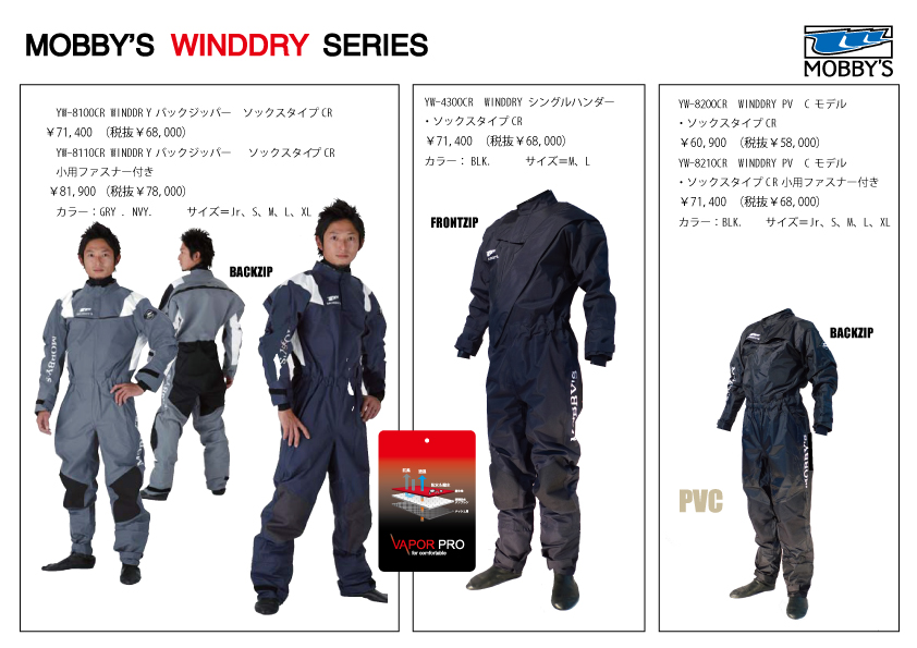 | Discount sale for Mobby's Dry Suits Wind Dry Sox Type_________71,400 --> 53,550 yen Wind Dry With Small Zipper___81,900 -->61,420 yen Single Hander Sox Type_____71,400 -->53,550 yen Wind Dry PVC Type_________60,900 -->45,680 yen |